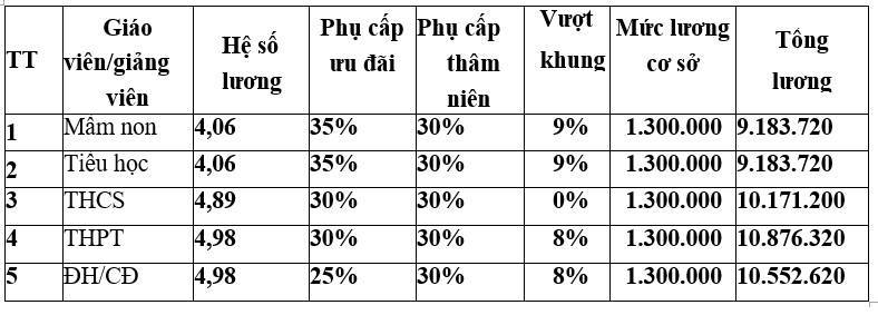Mức thu nhập cao tập trung ở sô giáo viên đã công tác được khoảng trên 25. Cụ thể với giáo viên đã công tác được 25 năm thì mức lương dao động từ 9.183.720 đồng (giáo viên mầm non/tiểu học) tới 10.171.200 đồng (giáo viên THCS) và 10.876.320 đồng (giáo viên THPT và giảng viên đại học).