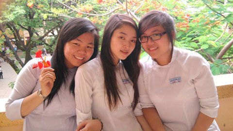 Hoàng Uyên (bên trái, cầm hoa phượng) và các bạn |