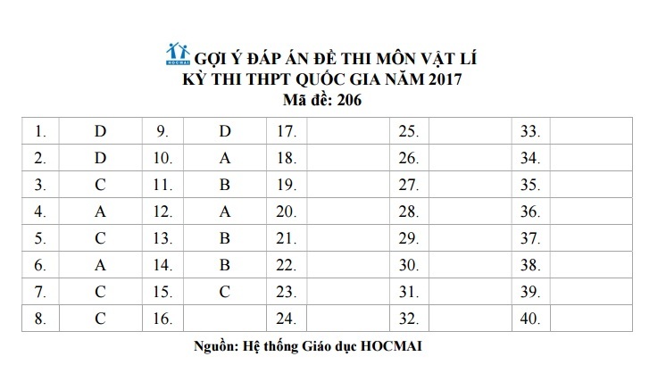 Lời giải tham khảo môn Vật lý mã đề 206 tốt nghiệp THPT quốc gia 2017 đang cập nhật.