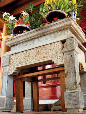 Bệ đá trong đền Quan Đế được dựng lại từ những mảng đá bị tản mát trong khuôn viên. - Ảnh: SGTT