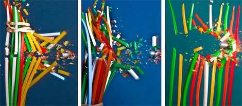| Một bó thìa khuấy cocktail vỡ tan khi viên đạn bắn xuyên qua. Ảnh: Exclusivepic. |