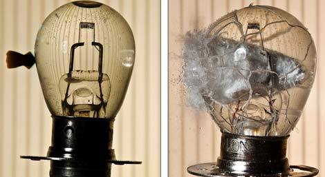 | Viên đạn (trái) vài giây trước khi phá tan bóng đèn (phải). Ảnh: Exclusivepic. |