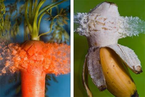 | Một củ cà rốt và một quả chuối bị biến dạng sau khi va chạm với viên đạn. Ảnh: Exclusivepic. |