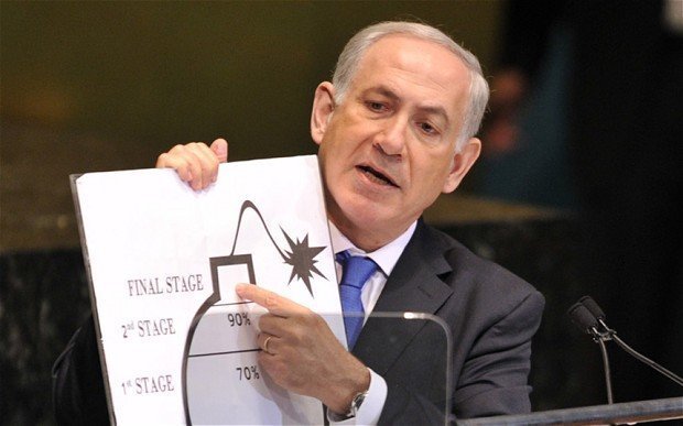 Phát biểu tại một cuộc họp của Đại hội đồng LHQ vào tháng 9/ 2012, Benjamin Netanyahu lấy tay chỉ vào vạch đỏ ghi con số 90% trên tấm poster vẽ một quả bom, tượng trưng cho chương trình hạt nhân của Iran và nói: "Họ đã đạt đến mức độ này”.
