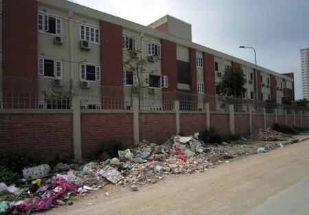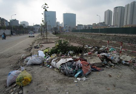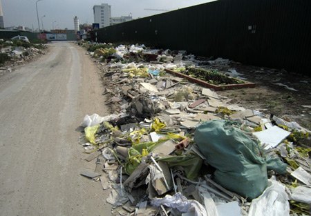 | Rác rải dọc bờ tường bao một trường học tại khu đô thị Nam Trung Yên. |