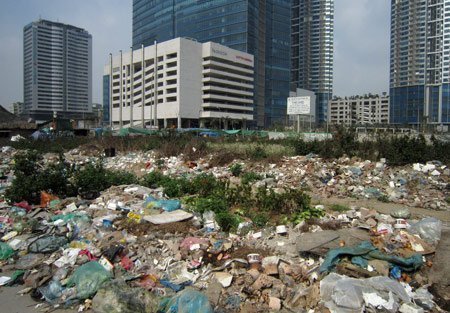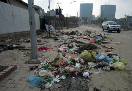 | Con đường dẫn vào phía sau tòa nhà KeangNam (Khu đô thị Nam Trung Yên) ngập tràn rác đủ loại. |