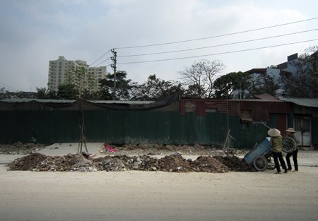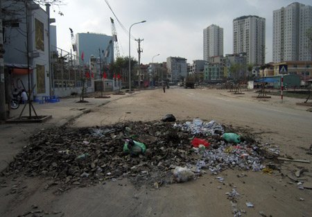 | Đất đá thải được đổ thoải mái ra giữa đường (Khu đô thị Yên Hòa). |