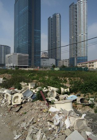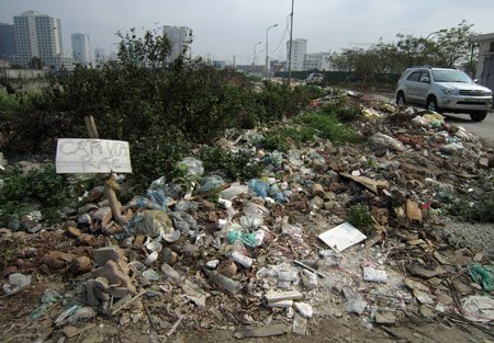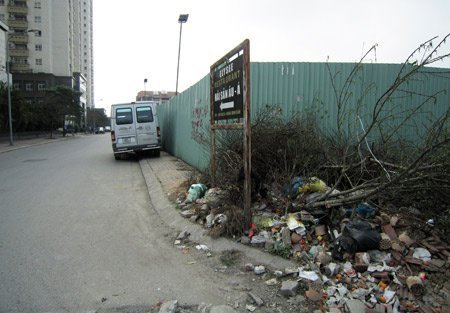 | Bãi rác khổng lồ trên khu đất phục vụ tái định cư tại khu đô thị Nam Trung Yên đã cắm biển nhưng chưa biết khi nào mới xây dựng. |