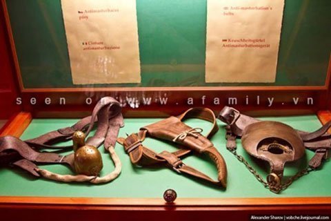 Các loại đai trinh tiết làm bằng da được trưng bày tại bảo tàng Dụng cụ tình dục Prague ở Séc