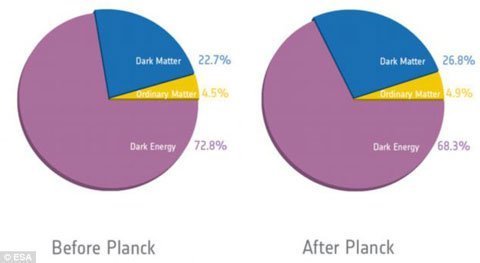 Dữ liệu của kính thiên văn Planck cũng chỉ ra rằng, vũ trụ của chúng ta có nhiều vật chất tối hơn so với quan niệm phổ biến lâu nay. Tới 26,8% vũ trụ dường như là vật chất tối, một hiện tượng vô hình đối với mắt thường và các nhà khoa học chỉ có thể phát hiện ra nó một cách gián tiếp. Giới nghiên cứu kỳ vọng các thử nghiệm ở cả trong không gian và máy gia tốc hạt lớn (LHC) sẽ có thể làm rõ vấn đề này.