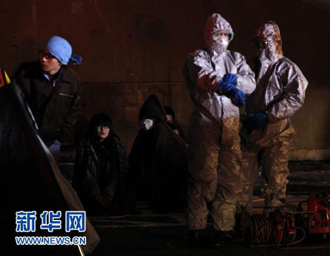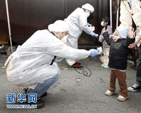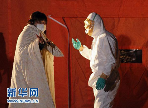 Các nhân viên kiểm tra mức ảnh hưởng phóng xạ của những người dân vừa di tản từ khu vực phụ cận nhà máy điện hạt nhân Fukushima số 2 đến trung tấm cứu nạn khẩn cấp. |