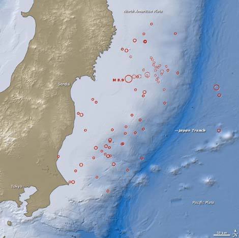 | Bản đồ này cho thấy vị trí của trận động đất ngày 11/3/2011 tại Nhật Bản, cũng như các tiền chấn (đường tròn đứt đoạn) và các dư chấn (đường tròn liền mạch). Kích thước của các vòng tròn tương ứng với cường độ của trận động đất hoặc cơn địa chấn liên quan. Ảnh: USGS |