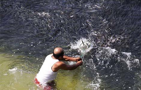 | Một thanh niên đã lao xuống nước dùng tay bắt cá. Ảnh: Reuters. |