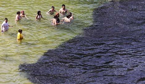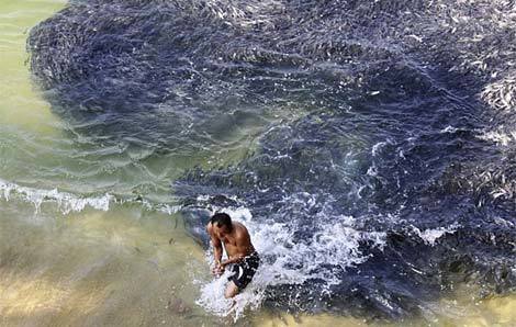 | Những đàn cá đen kịt trông như vết dầu loang. Ảnh: AP. |