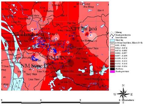 Số liệu thu thập được đã được tổng hợp và trình bày dưới dạng bản đồ kỹ thuật số và giản đồ. Các kết quả đo suất liều hấp thụ hiệu dụng được biểu diễn trên các bản đồ (hình 2a và hình 2b). Các vị trí khảo sát là các hình tròn, độ đậm nhạt trên hình thể hiện mức suất liều cao thấp.