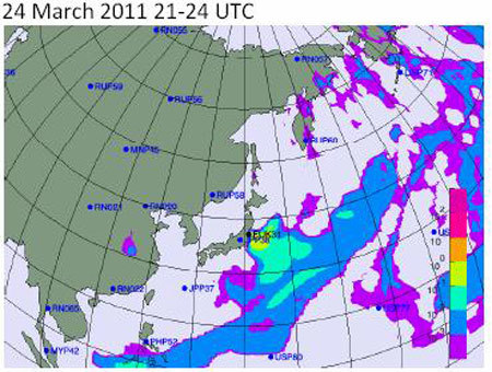 Theo số liệu quan trắc từ trung tâm dữ liệu quốc gia của Hiệp ước cấm thử vũ khí hạt nhân toàn diện (CTBTO) hôm 23/3, cho thấy, đám mây phóng xạ đã phát tán đến 3 ba vùng là Đông Nam Á, Thái Bình Dương và Đại Tây Dương.