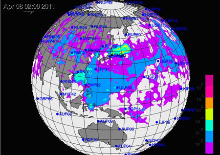Bản báo cáo mới nhất của Tổ công tác xử lý thông tin sự cố nhà máy điện hạt nhân Fukushima I của Bộ Khoa học và Công nghệ cho hay, đến cuối ngày 07/4 phần đám mây màu xanh dương (trong bản đồ) có nồng độ hạt nhân phóng xạ cao hơn cỡ 100 lần so với phần mây tím tiến gần đến đảo Hải Nam (Trung Quốc).