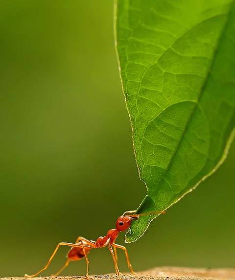 Một bức ảnh khác lại cho thấy sức mạnh siêu phàm của kiến lửa khi một con kiến có thể nâng bổng lên trên đầu một chiếc lá khổng lồ, ước chừng có kích thước gấp 10 lần chiều cao của nó. Bằng động tác này, con kiến đã dễ dàng mang theo chiến lợi phẩm trong cuộc hành trình của cả đàn.