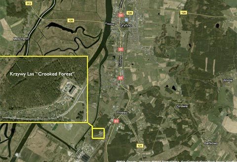 Vị trí “khu rừng cong” Krzywy Las ở phía tây Ba Lan. Điều đặc biệt về khu rừng này là nó được bao quanh bởi một rừng thông lớn với các thân cây phát triển thẳng bình thường.