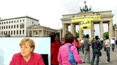 | Thủ tướng đương nhiệm Angela Merkel và cổng Brandenburg phân chia Đông Tây thành phố Berlin thời chiến tranh lạnh, bà đang chèo lái con thuyền điện hạt nhân theo một vòng quỹ đạo hình chữ U. |