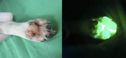 | Một chân của Tegon trong điều kiện ánh sáng bình thường và phát sáng huỳnh quang màu xanh lá cây dưới ánh sáng cực tím. Ảnh: Reuters. |