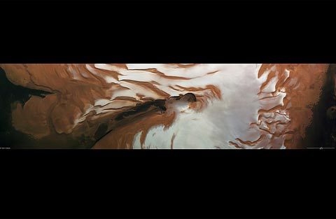Bức tranh toàn cảnh ở vùng cực bắc sao Hỏa trong ngày Hạ chí 17/5/2011. Những dữ liệu thu thập từ hành tinh đỏ cho rằng có những chóp được bao phủ bởi nước đóng băng và carbon dioxide tồn tại ở dạng băng trong mùa đông và mùa xuân. Tuy nhiên, trong thời gian Hạ chí, tất cả carbon dioxide ấm lên và bốc hơi lên bầu khí quyển, chỉ còn lại nước đóng băng, được thể hiện ở khu vực trắng sáng trong bức ảnh này.