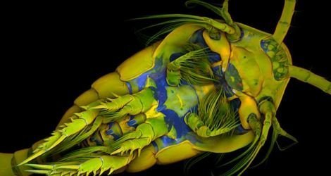 Một con copepod biển dưới kính hiển vi của giáo sư Jan Michels của trường ĐH Christian-Albrechts-Universität zu Kiel (Đức). Góc chụp từ bụng lên, độ phóng đại 10x.