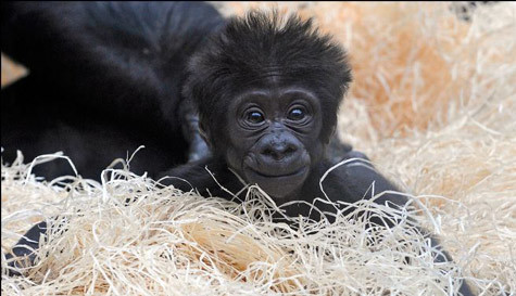 Hình ảnh của chú Gorilla có tên là Kajolu, sinh vào đầu năm 2010. Kajolu đang ngồi nhìn ra xung quanh trên một chiếc giường rơm tại sở thú ở Munich, Đức.