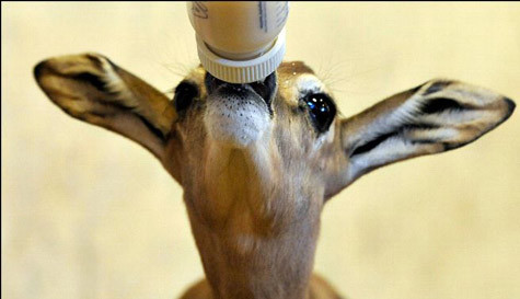 Hình ảnh một con linh dương gazen có tên Mhorr đang uống sữa rất ngon lành Vườn thú Budapest ở Hungary. Loài linh dương này được xem là đã tuyệt chủng trong môi trường tự nhiên. Hiện nay, chỉ còn khoảng 140 cá thể đang sống trong môi trường nuôi nhốt ở các vườn thú khác nhau trên thế giới.