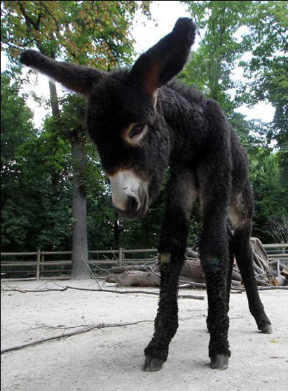 Một chú lừa con đang đứng trong tư thế rất ngộ nghĩnh tại vườn thú Schoenbrunn. Lừa Poitou có nguồn gốc từ vùng Poitou nước Pháp. Hiện nay, số lượng loài động vật này còn khoảng 400 con sau khi tăng hơn 300 con so với số lượng 44 con vào năm 1977.