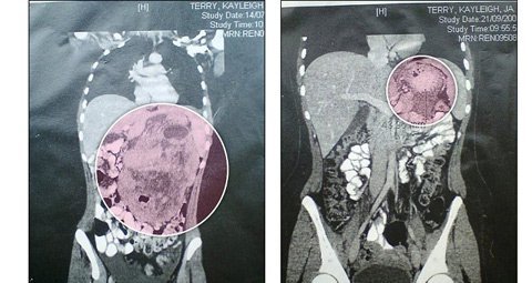 Sau nhiều cơn đau âm ỉ ở vùng bụng và dấu hiệu mệt mỏi thường xuyên, Kayleigh Terry đã đi chụp siêu âm. Ảnh chụp đã cho thấy một hình ảnh đáng sợ: Terry đang mong trung bụng một khối u to bằng quả dưa hấu, chèn từ khu vực dưới ngực xuống bụng dưới.