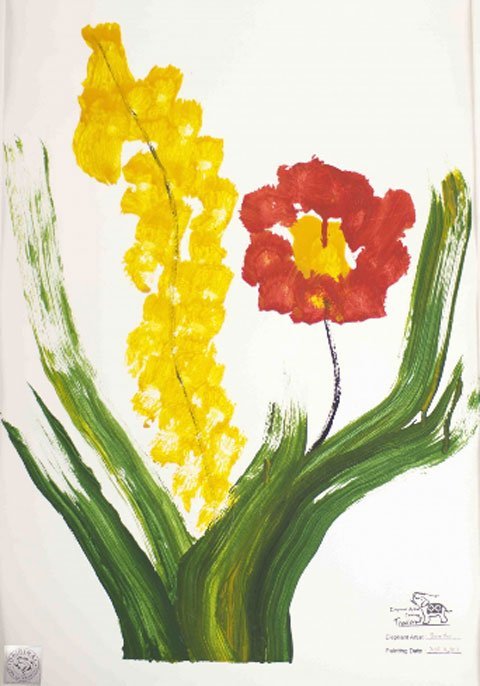 Các nhân viên thuyết minh cho hay, một điểm sáng của cuộc triển lãm là bức tranh vẽ hoa này của chú voi Boon Mee thuộc vườn thú Samutprakarn, Thái Lan. Cách “sáng tác” của họa sĩ voi cũng được tiết lộ như sau: người quản tượng sẽ cho voi dùng vòi ngậm cọ vẽ và “điều hướng” vẽ bằng cách kéo tai của “họa sĩ”. |