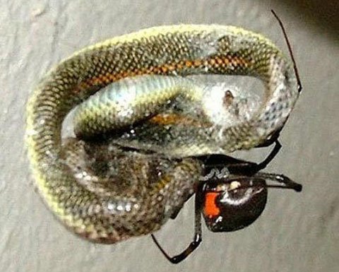 Vết đỏ trên bụng của rắn là bằng chứng về nơi con nhện bắt đầu rỉa thịt rắn.