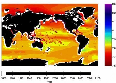 Máy tính dự đoán về nồng độ pH trong nước biển vào năm 2100 dựa trên lượng khí thải vào khí quyển như hiện nay. Các chấm màu tím để chỉ các rặng san hô nước lạnh, trong khi chấm đỏ biểu thị san hô nước ấm. Thang điểm pH nằm bên tay phải. |