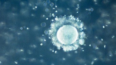 Tinh trùng đang bao quanh một trứng (độ phóng đại 400 lần). |