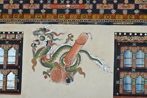 Cũng tại tu viện này, truyền thuyết kể rằng đại sư trụ trì Drupka Kinley đã dùng dương vật của mình để đánh bại quỷ dữ và biến chúng thành nô lệ. Từ đó, mọi người vẽ Linga trước cửa nhà để cầu bình an.