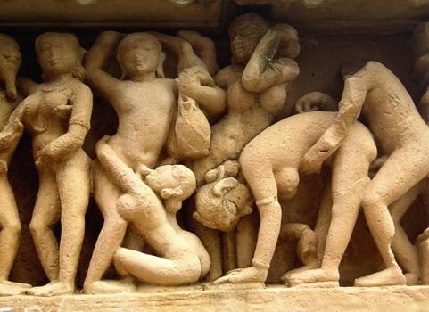 Khắp bề mặt các ngôi đền, từ những bậc đá lên tới tận đỉnh tháp, là những bức tượng bằng đá diễn tả cảnh sinh hoạt mọi mặt của người Ấn Ðộ. Từ cảnh ăn chơi xa hoa của vua chúa trong hoàng cung cho đến cảnh lao động, học hành tu tập, thuần hóa thú dữ. Ðặc biệt, xen kẽ giữa các nữ thần là những nhóm tượng cặp trai gái, hoặc từng nhóm trai gái, đang giao hoan.