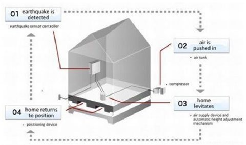 Khi động đất xảy ra, một bộ cảm biến bên trong tòa nhà sẽ phát hiện chuyển động và kích hoạt một máy nén bơm không khí vào các túi bên dưới nhà trong vòng 1 giây. Không khí đủ để nâng toàn bộ kết cấu bên trên nhà tách khỏi nền, lên cao khoảng 3cm (1,2 inch) và duy trì trạng thái này chừng nào mặt đất còn rung chuyển.