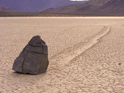 Đá có thể đi bộ trên trái đất, ít nhất là ở lòng hồ cạn Racetrack Playa tại Thung lung chết (California, Mỹ). Ở đó, một cơn bão hoàn hảo có thể làm dịch chuyển những tảng đá đôi khi có trọng lượng hàng chục hoặc hàng trăm kg. Theo các nhà nghiên cứu NASA, nhiều khả năng, các tảng đá bị băng bao phủ đã bị nước tan chảy từ các ngọn đồi phía trên kéo trượt đi trên lòng hồ bằng phẳng.