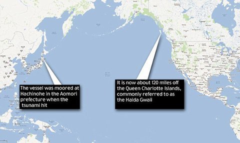 Theo Daily Mail, nếu tính từ thời điểm xảy ra thảm họa động đất và sóng thần ở Nhật Bản ngày 11/3/2011 cho tới nay, con tàu cá này đã trôi dạt trên đại dương hơn một năm và vượt qua khoảng cách lên tới 4.703 dặm (khoảng 7.500 km).