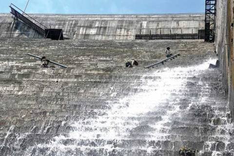 Rò rỉ nước ở thủy điện Sông Tranh 2. Ảnh: SGTT |
