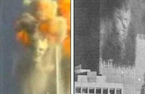Hai bức ảnh (ảnh trái trích từ đoạn video của kênh CNN và ảnh phải do nhiếp ảnh gia tự do Mark D. Phillips chụp) ghi lại khoảnh khắc khi tòa tháp đôi của Trung tâm Thương mại thế giới bốc cháy sau vụ tấn công khủng bố ngày 11/9/2001. Đây hoàn toàn là những bức ảnh nguyên gốc, chưa qua chỉnh sửa.