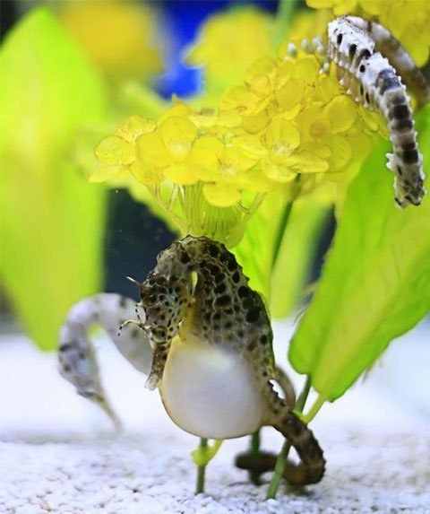 Cá ngựa đực nổi tiếng trong vương quốc động vật là những ông bố tận tâm đến mức đảm nhiệm cả vai trò ấp trứng. Ở loài này, con cái sẽ đẻ những quả trứng chưa được thụ tinh vào một cái túi trong bụng của con đực. Con đực sẽ thụ tinh và bảo vệ những quả trứng này trong nhiều tuần sau đó “đẻ” ra từ 5 – 1.500 con non. Do cá ngựa không có tập quán nuôi dưỡng con nên những con non sẽ phải ra ở riêng ngay sau khi rời “lồng ấp” trong bụng bố.