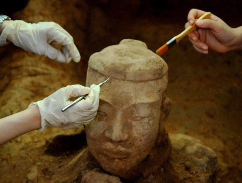 Một chiếc đầu tượng vừa phát hiện. Ảnh: Tân Hoa Xã. |