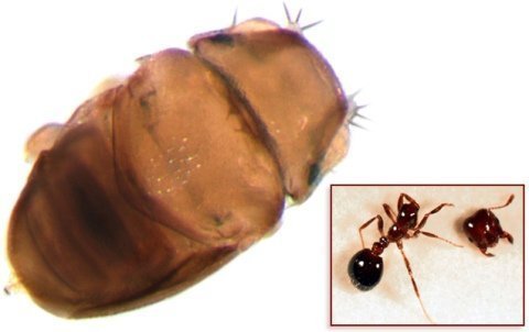 | Ruồi Euryplatea nanaknihali (ảnh chính) sống ký sinh trên cơ thể một loài kiến. |
