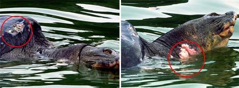 | 2 vết thương mới nhất của cụ rùa Hồ Gươm được phát hiện ngày 30/12/2010. Ảnh VNE. |