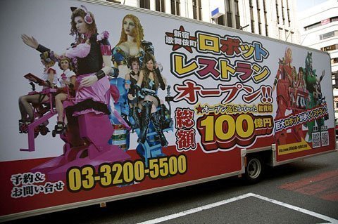 | Để quảng bá tới mọi người, nhà hàng mới khai trương đã cho xe kéo hai nàng vũ nữ robot khổng lồ diễu hành qua các khu phố ở Shinjuku. Ảnh Daily Mail |