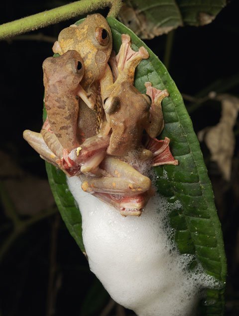 Ếch cây harlequin (tên khoa học Rhacophorus pardalis) sống trên cao trong những tán rừng già ở đảo Borneo (Đông Nam Á). Chúng có thể lượn cơ thể như “bay” từ cây này sang cây khác. Trong ảnh là 2 con ếch đực đang “tranh giành” một con cái đang tạo ổ bọt đẻ trứng. Khi trứng nở, nòng nọc sẽ rớt xuống ao ở phía dưới.