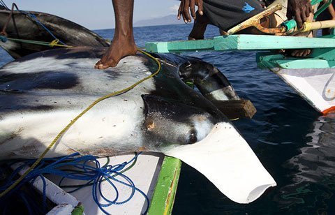Một con cá đuối hai mồm tại vùng biển Indonesia đã bị ngư dân đâm trúng để lấy mang cá và thịt. Ảnh: Paul Hilton/Manta Ray Of Hope
