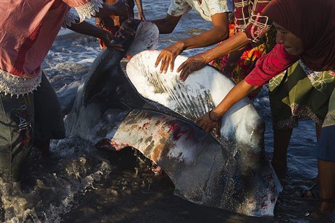 Họ tiến hành cắt đầu và sải vây bơi cá đuối, sau đó mới lấy mang. Một con cá đuối hai mồm trưởng thành có thể lấy được 7 kg mang khô và bán với giá gần 470USD/kg cho thị trường Trung Quốc. Ảnh: Paul Hilton/Manta Ray Of Hope
